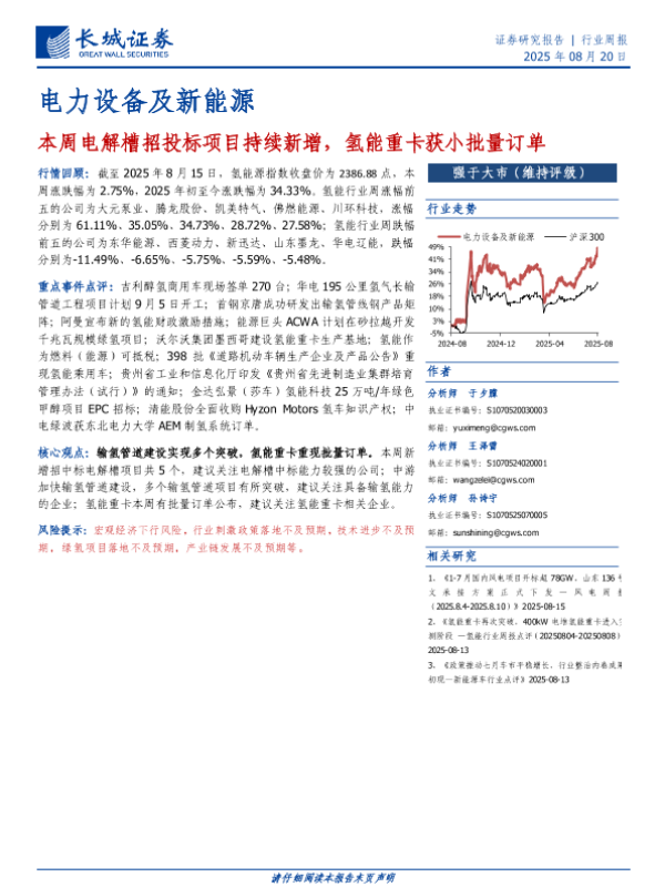 【长城证券】【20250820】电力设备及新能源行业周报:本周电解槽招投标项目持续新增,氢能重卡获小批量订单-11页 证券期货研究报告