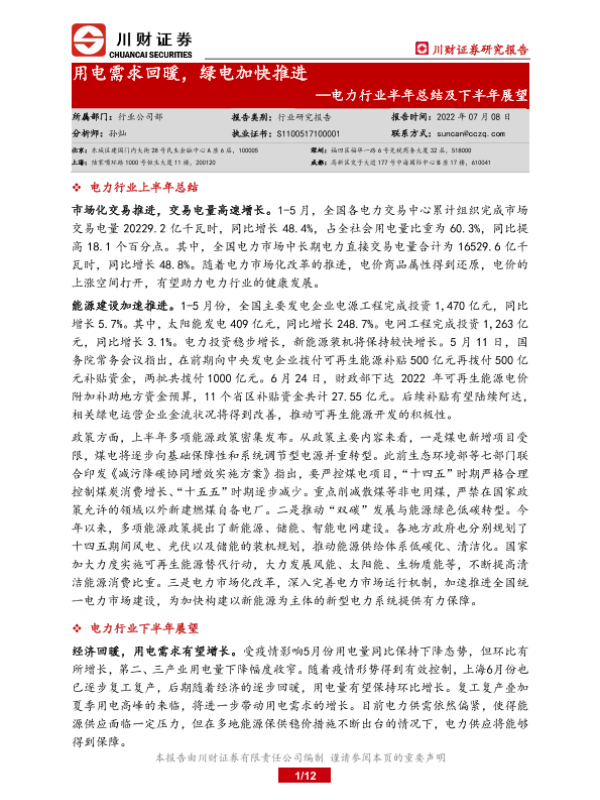 【川财证券】【20220708】电力行业半年总结及下半年展望:用电需求回暖,绿电加快推进-12页 行业研究