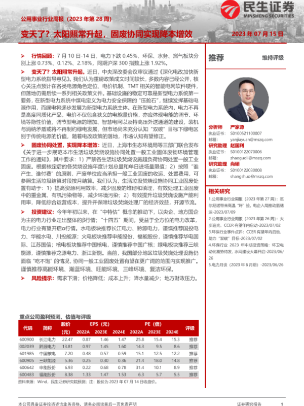 【民生证券】【20230715】公用事业行业周报:变天了?太阳照常升起,固废协同实现降本增效-29页 行业研究