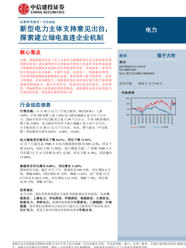 【中信建投证券】【20241209】2024年12月18日更新-【中信建投】电力行业动态:新型电力主体支持意见出台,探索建立绿电直连企业机制-16页 行业研究