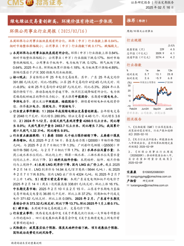 【海通证券】【20250216】环保公用事业行业周报:绿电绿证交易量创新高,环境价值有待进一步体现-18页 行业研究