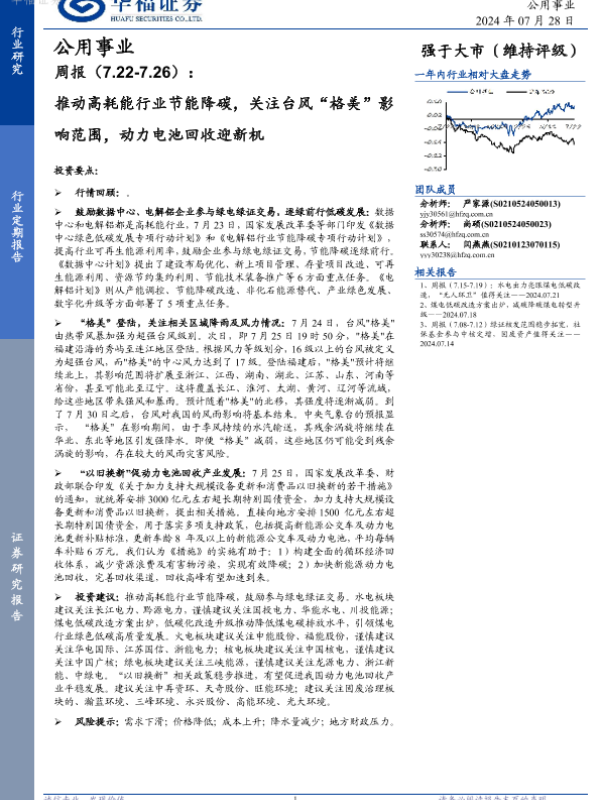 【华福证券】【20240728】推动高耗能行业节能降碳,关注台风“格美”影响范围,动力电池回收迎新机-21页 行业研究