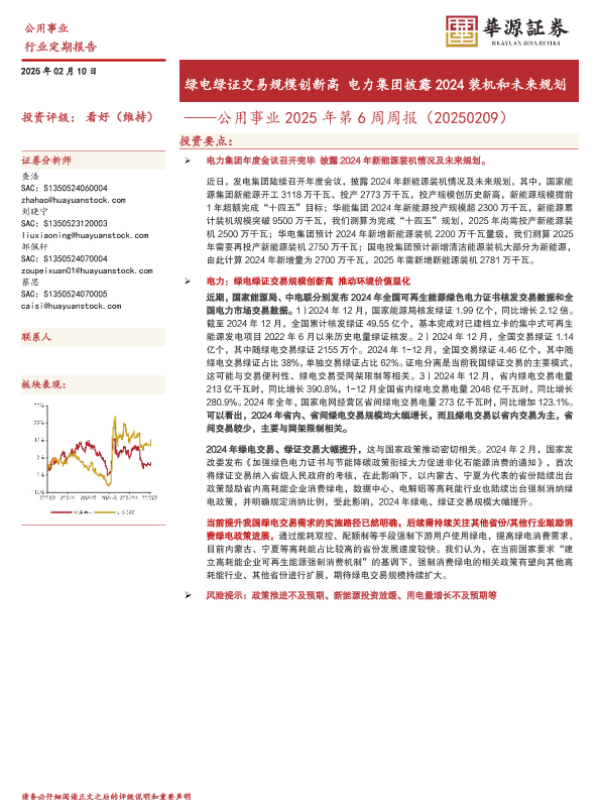 【华源证券】【20250210】公用事业2025年第6周周报:绿电绿证交易规模创新高 电力集团披露2024装机和未来规划-12页 行业研究