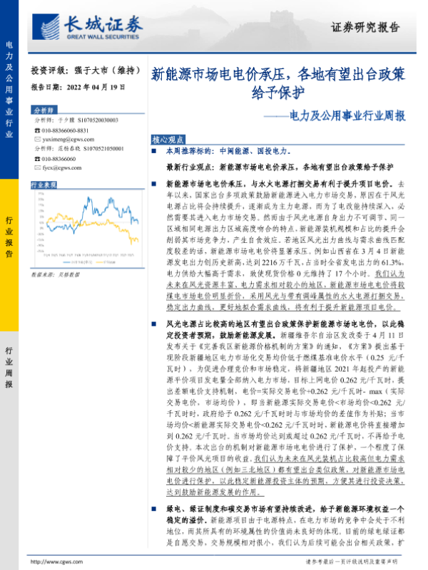 【长城证券】【20220419】电力及公用事业行业周报:新能源市场电电价承压,各地有望出台政策给予保护-10页 行业研究
