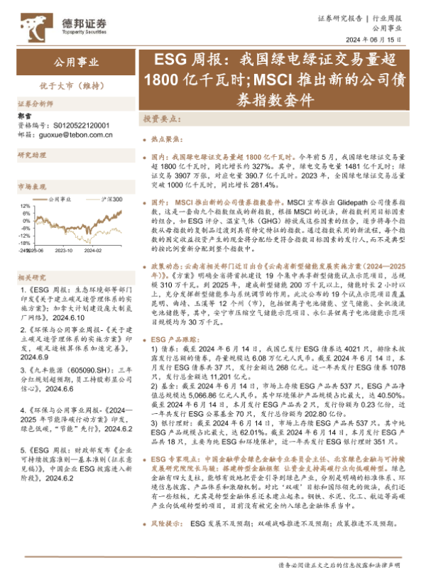 【德邦证券】【20240615】公用事业行业ESG周报:我国绿电绿证交易量超1800亿千瓦时;MSCI推出新的公司债券指数套件-12页 行业研究