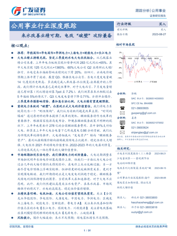【广发证券】【20230827】公用事业行业深度跟踪:来水改善业绩可期,电改“破壁”攻防兼备-31页 行业研究