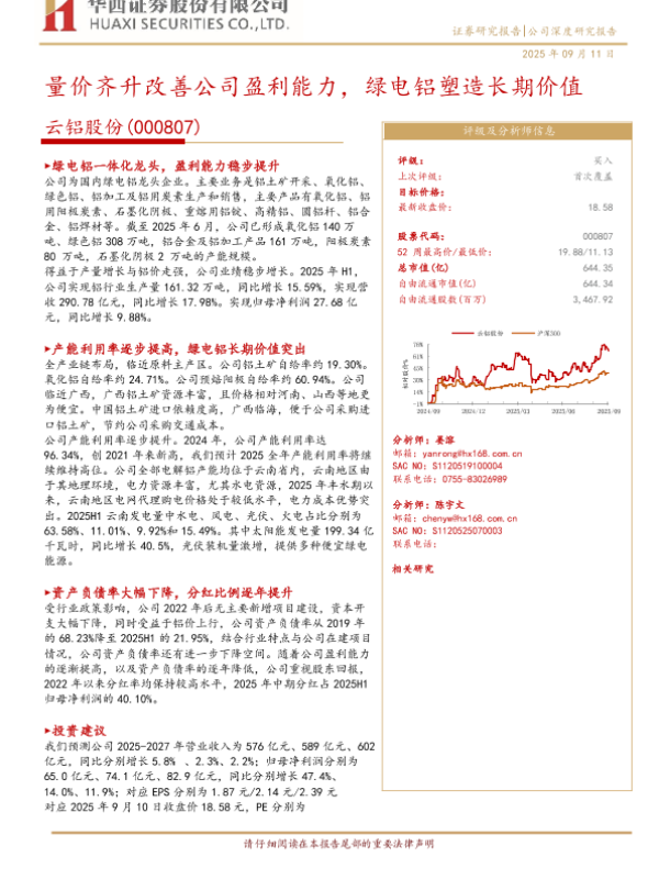 【华创证券】【202509】云铝股份(000807)深度研究报告:一体化绿电铝龙头,优质红利资产兼具弹性-24页 证券期货研究报告