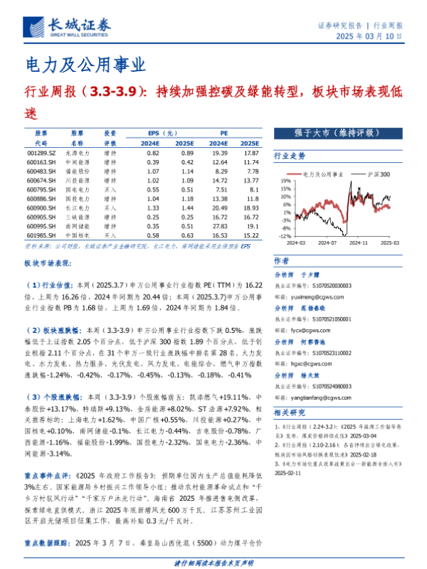 【长城证券】【20250310】电力及公用事业行业周报:持续加强控碳及绿能转型,板块市场表现低迷-14页 行业研究