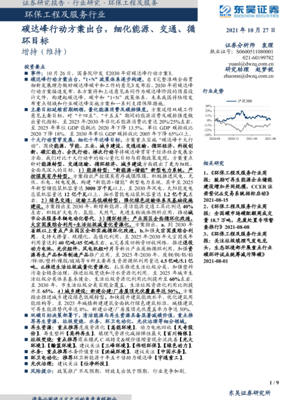 【东吴证券】【20211027】环保工程及服务行业碳达峰行动方案出台,细化能源、交通、循环目标-9页 行业研究