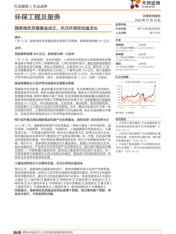 【天风证券】【20200716】环保工程及服务:国家绿色发展基金成立,关注环保低估值龙头-2页 行业研究