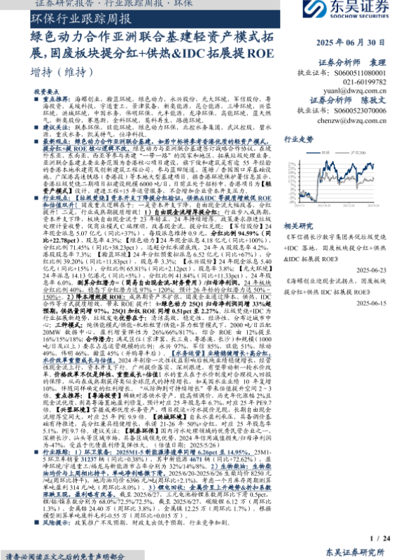 【东吴证券】【20250630】环保行业跟踪周报:绿色动力合作亚洲联合基建轻资产模式拓展,固废板块提分红+供热&IDC拓展提ROE-24页 证券期货研究报告