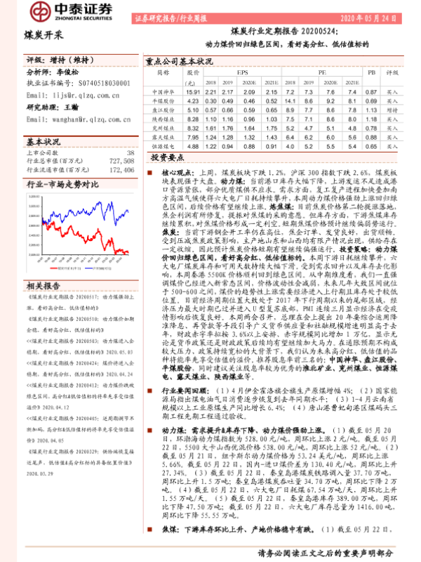 【中泰证券】【20200524】20200524-中泰证券-煤炭行业定期报告:动力煤价回归绿色区间,看好高分红、低估值标的-19页 行业研究