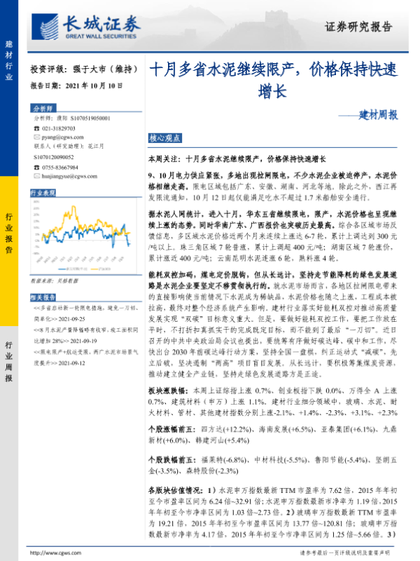 【长城证券】【20211010】十月多省水泥继续限产,价格保持快速增长-21页 行业研究