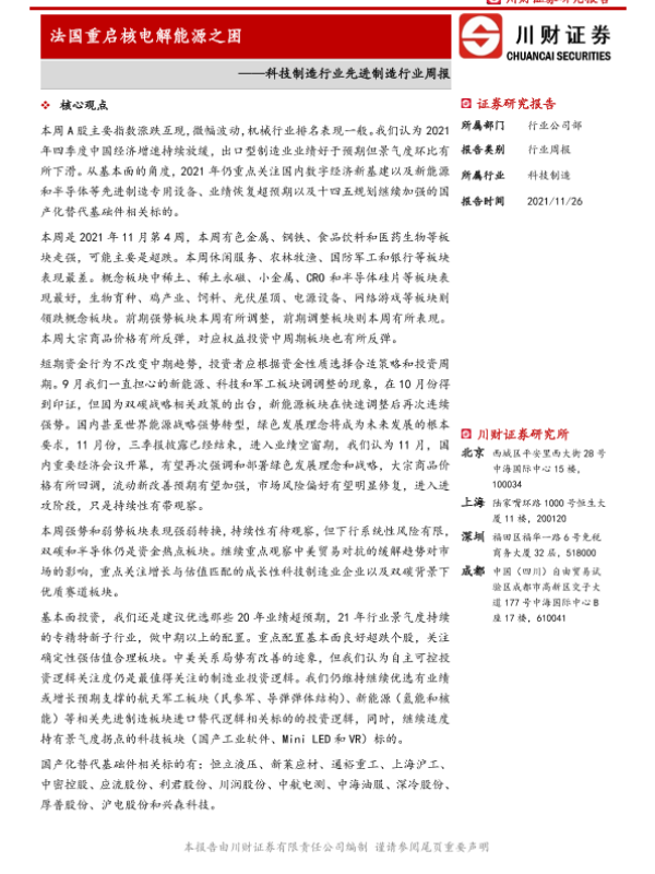 【川财证券】【20211126】科技制造行业先进制造行业周报:法国重启核电解能源之困-11页 行业研究