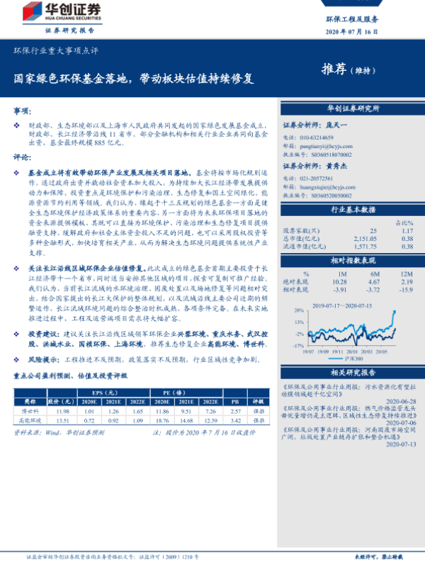 【华创证券】【20200716】环保行业重大事项点评:国家绿色环保基金落地,带动板块估值持续修复-3页 行业研究