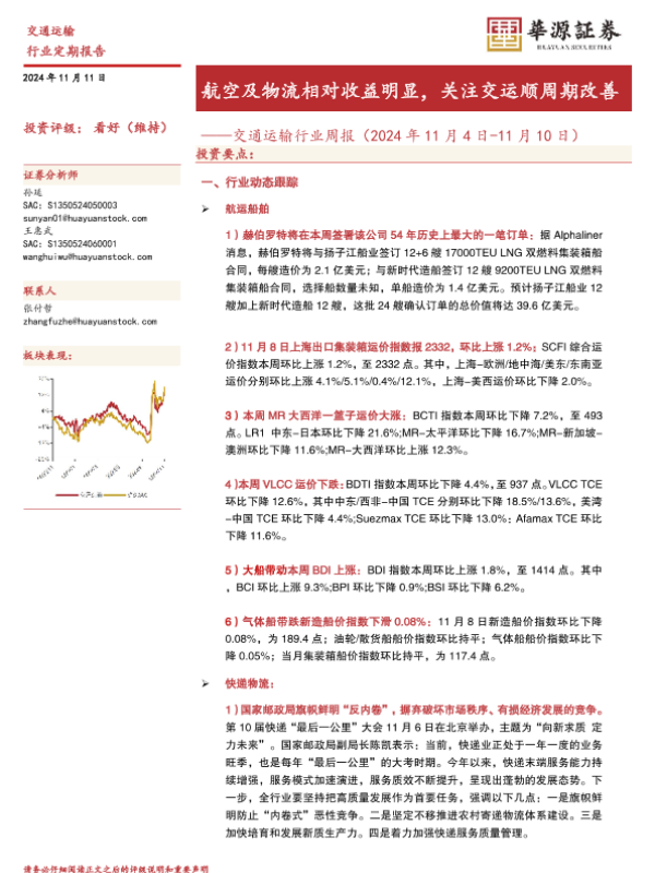 【华源证券】【20241111】交通运输行业周报:航空及物流相对收益明显,关注交运顺周期改善-14页 行业研究