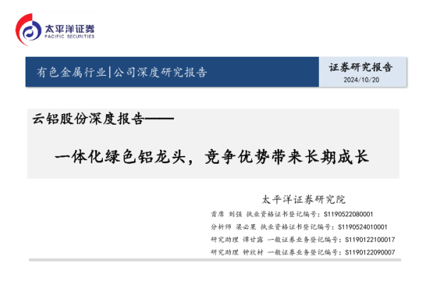 【太平洋证券】【20241020】20241020-太平洋-云铝股份-000807.SZ-云铝股份深度报告:一体化绿色铝龙头,竞争优势带来长期成长-33页 行业研究