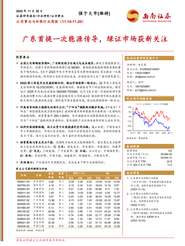 【西南证券】【20221120】公用事业与环保行业周报:广东首提一次能源传导,绿证市场获新关注-19页 行业研究