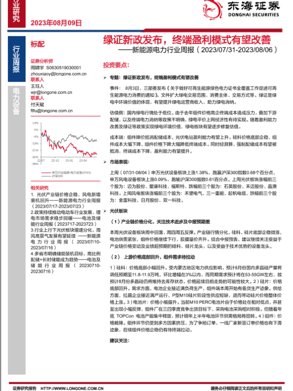 【东海证券】【20230809】新能源电力行业周报:绿证新政发布,终端盈利模式有望改善-21页 行业研究