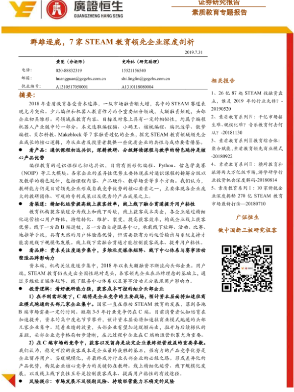 【广证恒生】【20190731】素质教育专题报告:群雄逐鹿,7家STEAM教育领先企业深度剖析-22页 行业研究