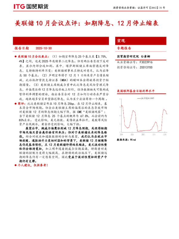 【国贸期货】【202510】美联储10月会议点评:如期降息、12月停止缩表-7页 证券期货研究报告
