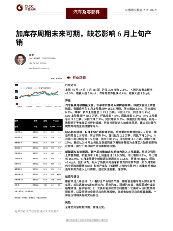 【中金公司】【20210621】汽车及零部件行业:加库存周期未来可期,缺芯影响6月上旬产销-14页 行业研究