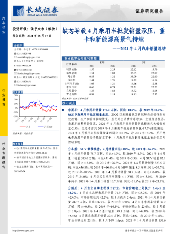 【长城证券】【20210517】2021年4月汽车销量总结:缺芯导致4月乘用车批发销量承压,重卡和新能源高景气持续-23页 行业研究