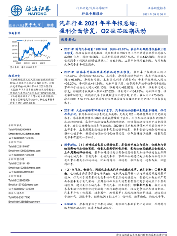 【海通证券】【20210906】汽车行业2021年半年报总结:盈利全面修复,Q2缺芯短期扰动-28页 行业研究
