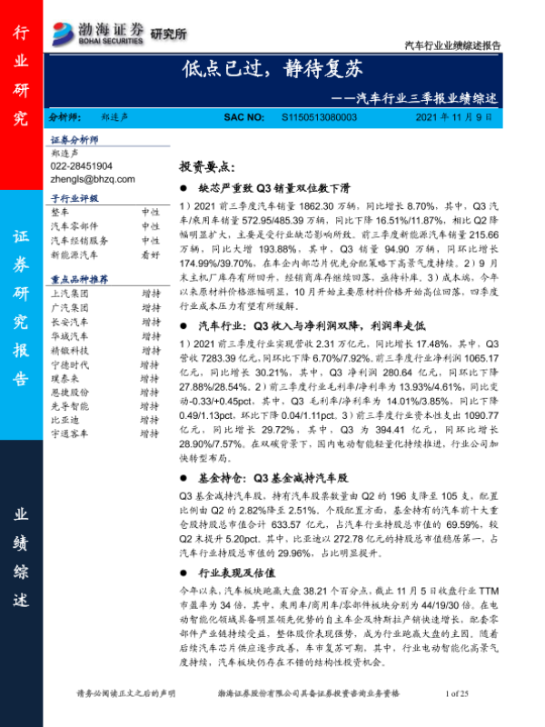 【渤海证券】【20211109】汽车行业三季报业绩综述:低点已过,静待复苏-25页 行业研究