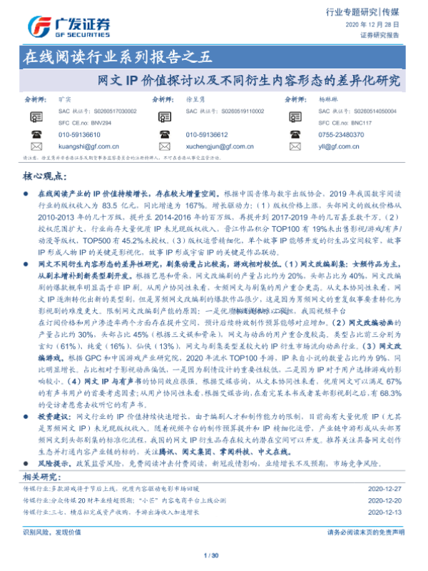 【广发证券】【20201228】2020.12.28-在线阅读行业系列报告之五:网文IP价值探讨以及不同衍生内容形态的差异化研究-30页 行业研究