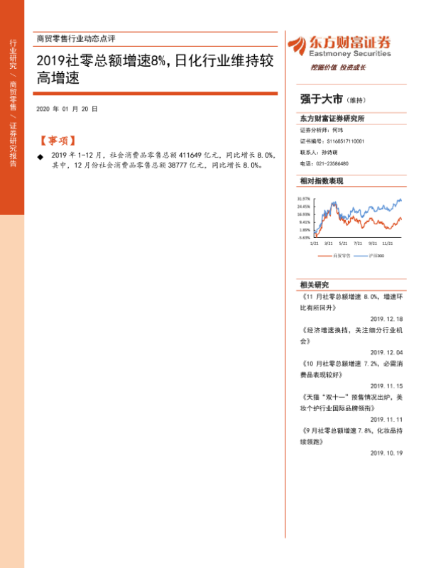 【东方财富证券】【20200120】2019社零总额增速8%,日化行业维持较高增速-3页 行业研究