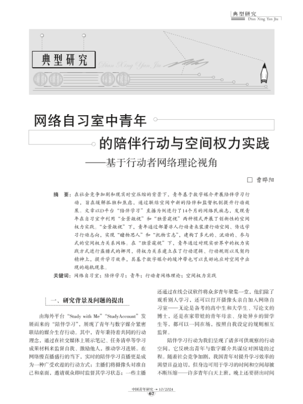 【曹晔阳】【202410】网络自习室中青年的陪伴行动与空间权力实践—基于行动者网络理论视角-10页 学术论文
