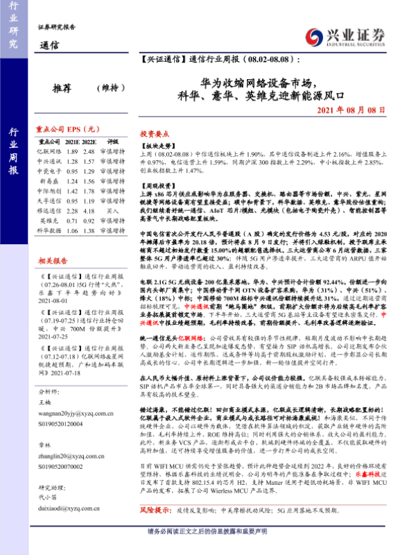 【兴业证券】【20210808】通信行业周报(08.02-08.08):华为收缩网络设备市场,科华、意华、英维克迎新能源风口-23页 行业研究