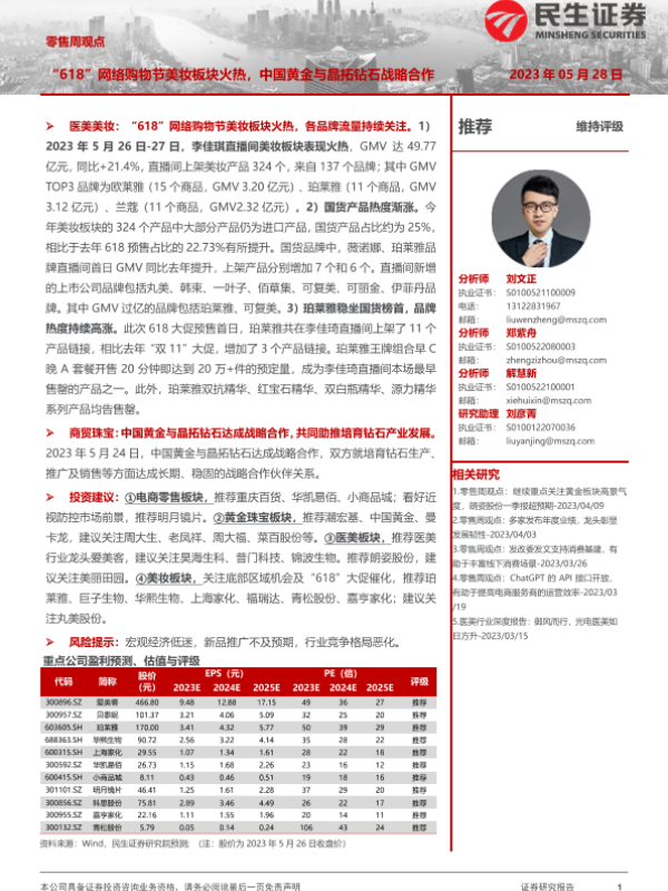 【民生证券】【20230528】零售周观点:“618”网络购物节美妆板块火热,中国黄金与晶拓钻石战略合作-18页 行业研究