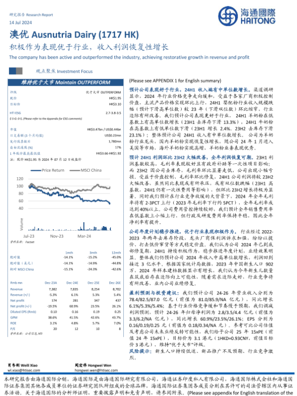 【海通国际】【20240714】澳优(1717.HK)积极作为表现优于行业,收入利润恢复性增长-13页 行业研究