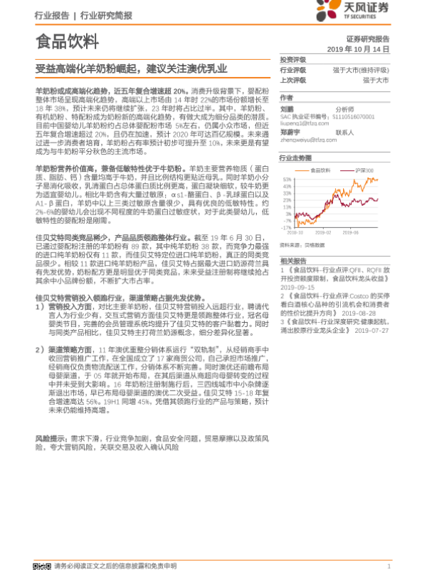 【天风证券】【20191014】食品饮料行业研究简报:受益高端化羊奶粉崛起,建议关注澳优乳业-12页 行业研究