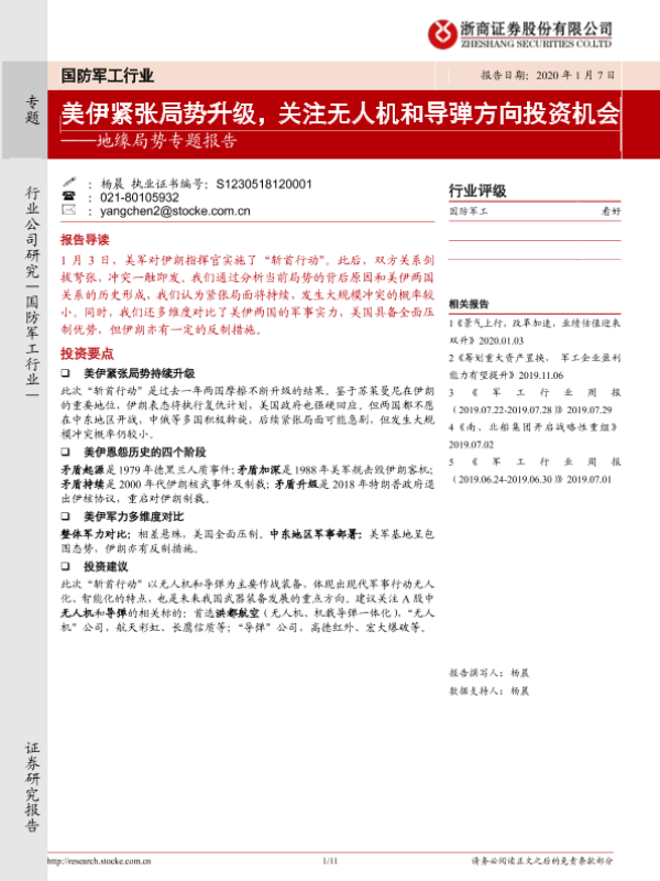 【浙商证券】【20200107】国防军工行业地缘局势专题报告:美伊紧张局势升级,关注无人机和导弹方向投资机会-11页 行业研究