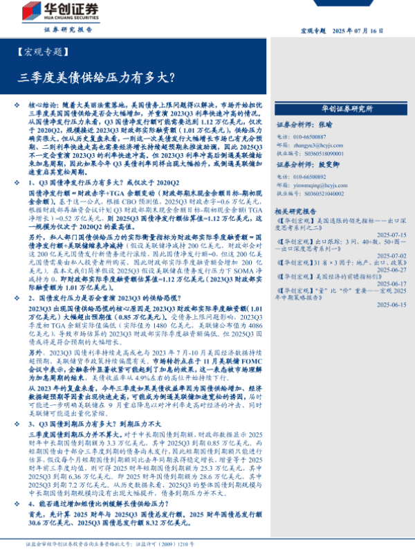 【华创证券】【20250716】三季度美债供给压力有多大?-16页 宏观策略