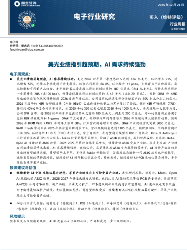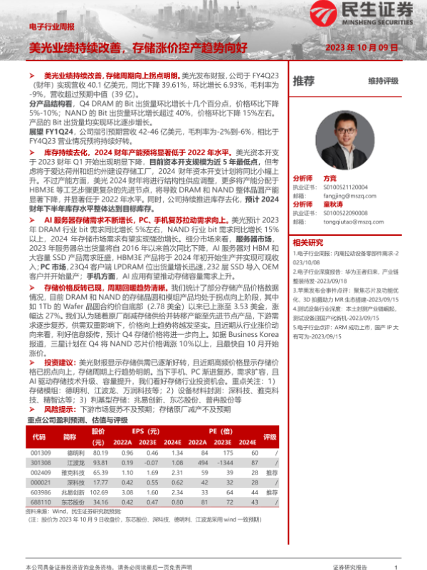 【民生证券】【20231009】电子行业周报:美光业绩持续改善,存储涨价控产趋势向好-11页 行业研究
