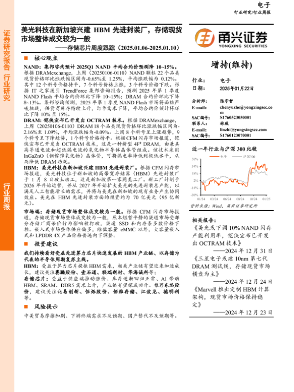 【甬兴证券】【20250122】存储芯片行业周度跟踪:美光科技在新加坡兴建HBM先进封装厂,存储现货市场整体成交较为一般-10页 行业研究