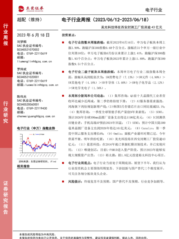 【东莞证券】【20230618】20230618-东莞证券-电子行业周报:美光科技将在西安封测工厂投资逾43亿元-12页 行业研究