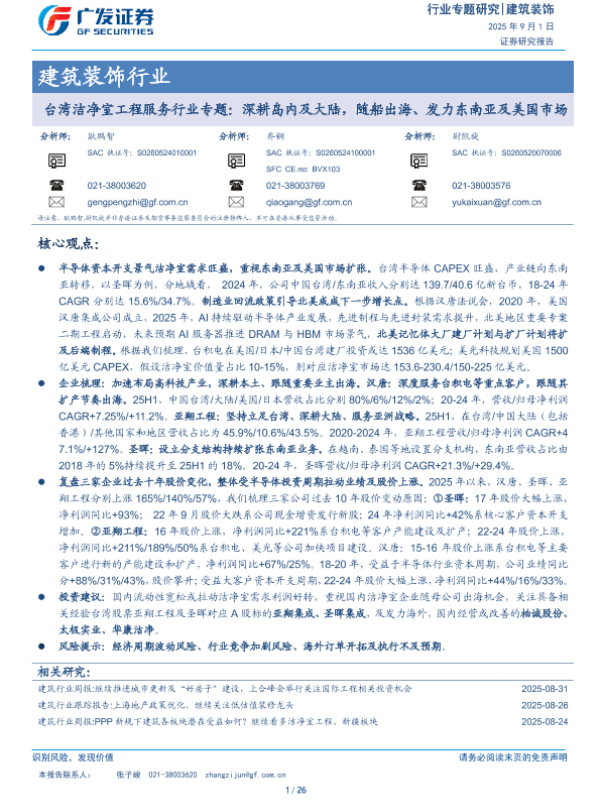 【广发证券】【202509】台湾洁净室工程服务行业专题:深耕岛内及大陆,随船出海、发力东南亚及美国市场-26页 证券期货研究报告