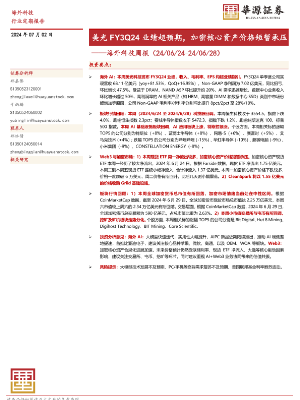 【华源证券】【20240702】海外科技周报:美光FY3Q24业绩超预期,加密核心资产价格短暂承压-13页 行业研究
