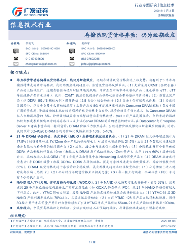 【广发证券】【20200902】信息技术行业:存储器现货价格异动:仍为短期效应-12页 行业研究