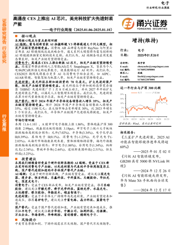 【甬兴证券】【20250126】电子行业周报:高通在CES上推出AI芯片,美光科技扩大先进封装产能-14页 行业研究