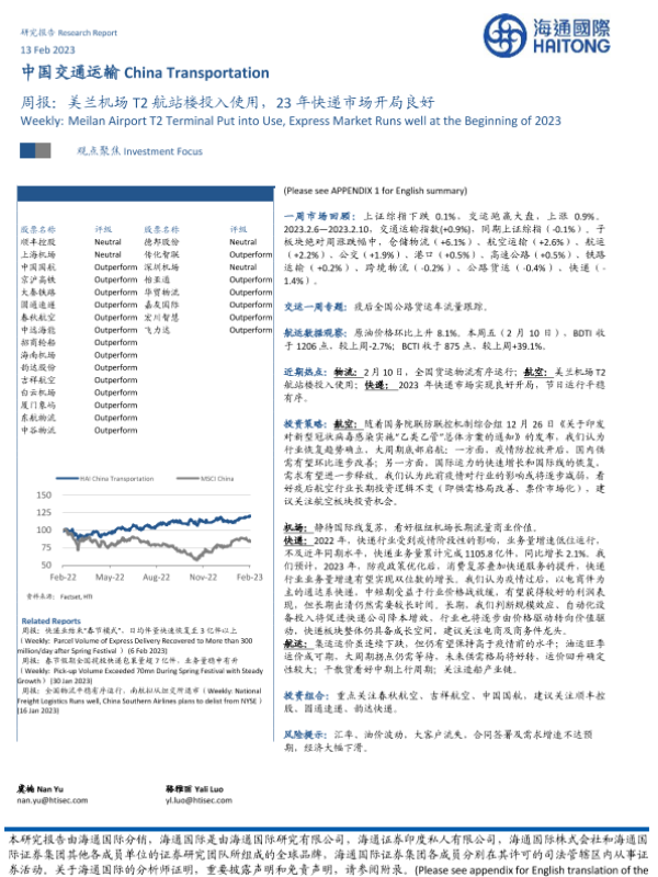 【海通国际】【20230213】中国交通运输周报:美兰机场T2航站楼投入使用,23年快递市场开局良好-14页 行业研究
