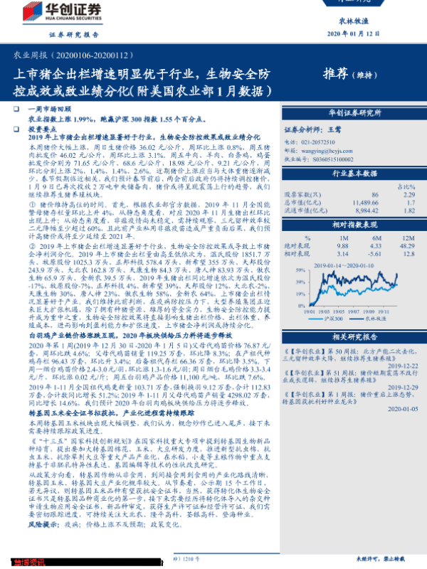 【华创证券】【20200112】20200112-华创证券-农业周报:上市猪企出栏增速明显优于行业,生物安全防控成效或致业绩分化 (附美国农业部1月数据)-49页 行业研究