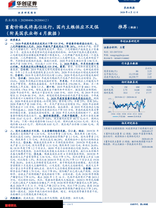 【华创证券】【20200412】20200412-华创证券-农业周报:畜禽价格或将高位运行,国内主粮供应不足惧(附美国农业部4月数据)-51页 行业研究