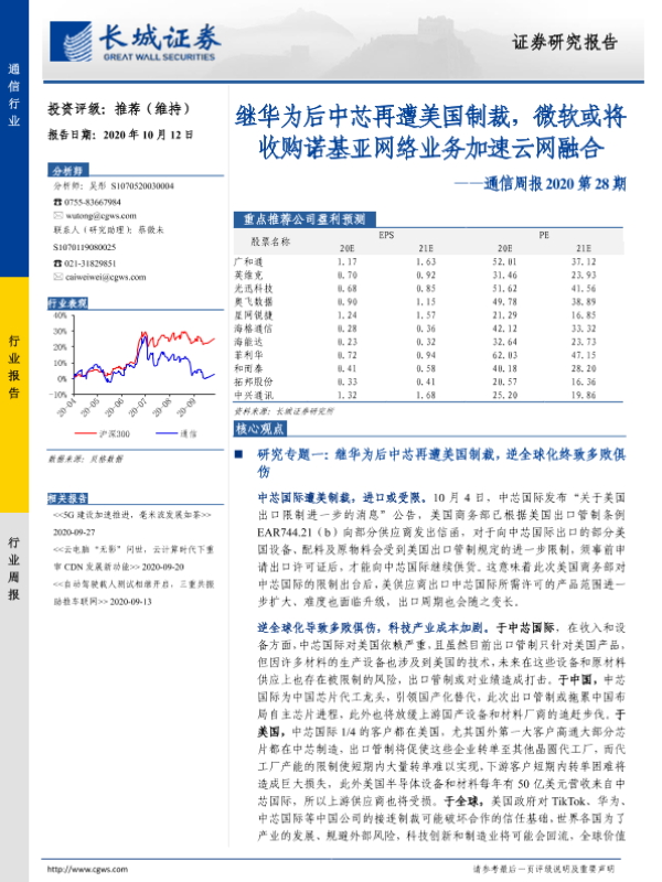 【长城证券】【20201012】通信周报2020第28期:继华为后中芯再遭美国制裁,微软或将收购诺基亚网络业务加速云网融合-31页 行业研究