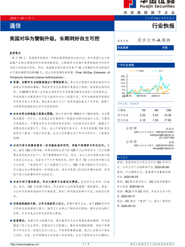 【华金证券】【20200517】通信行业快报:美国对华为管制升级,长期利好自主可控-7页 行业研究
